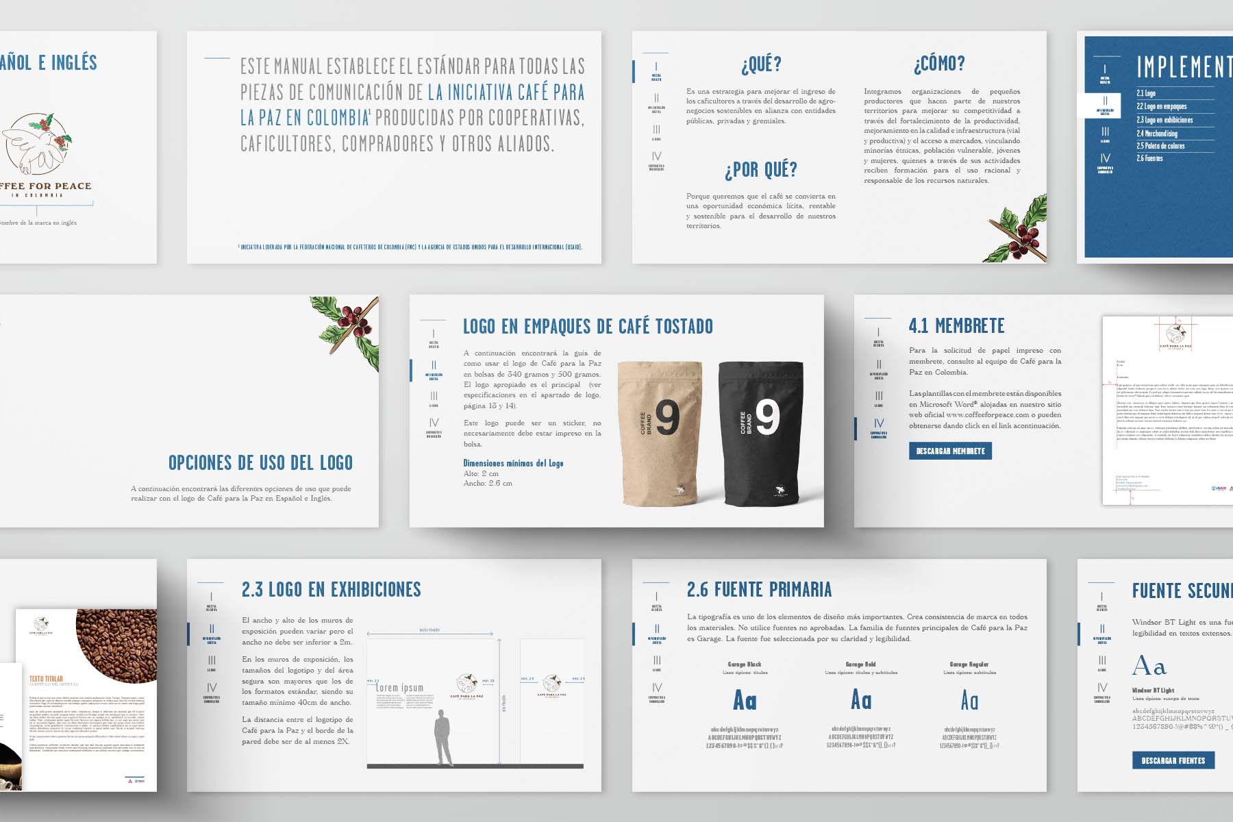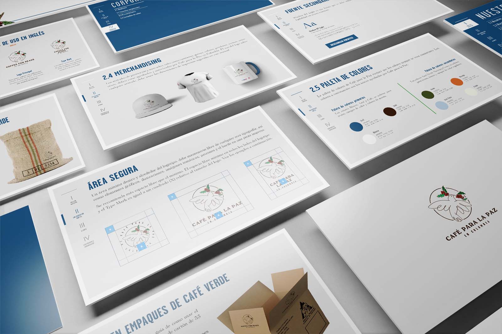 El manual de marca de Café para la Paz es un valioso recurso completo e interactivo que incluye guías de implementación gráfica y comunicaciones de la organización para garantizar una uso de la marca claro y coherente, lo que asegura una identidad visual fuerte y una comprensión adecuada de su propósito.